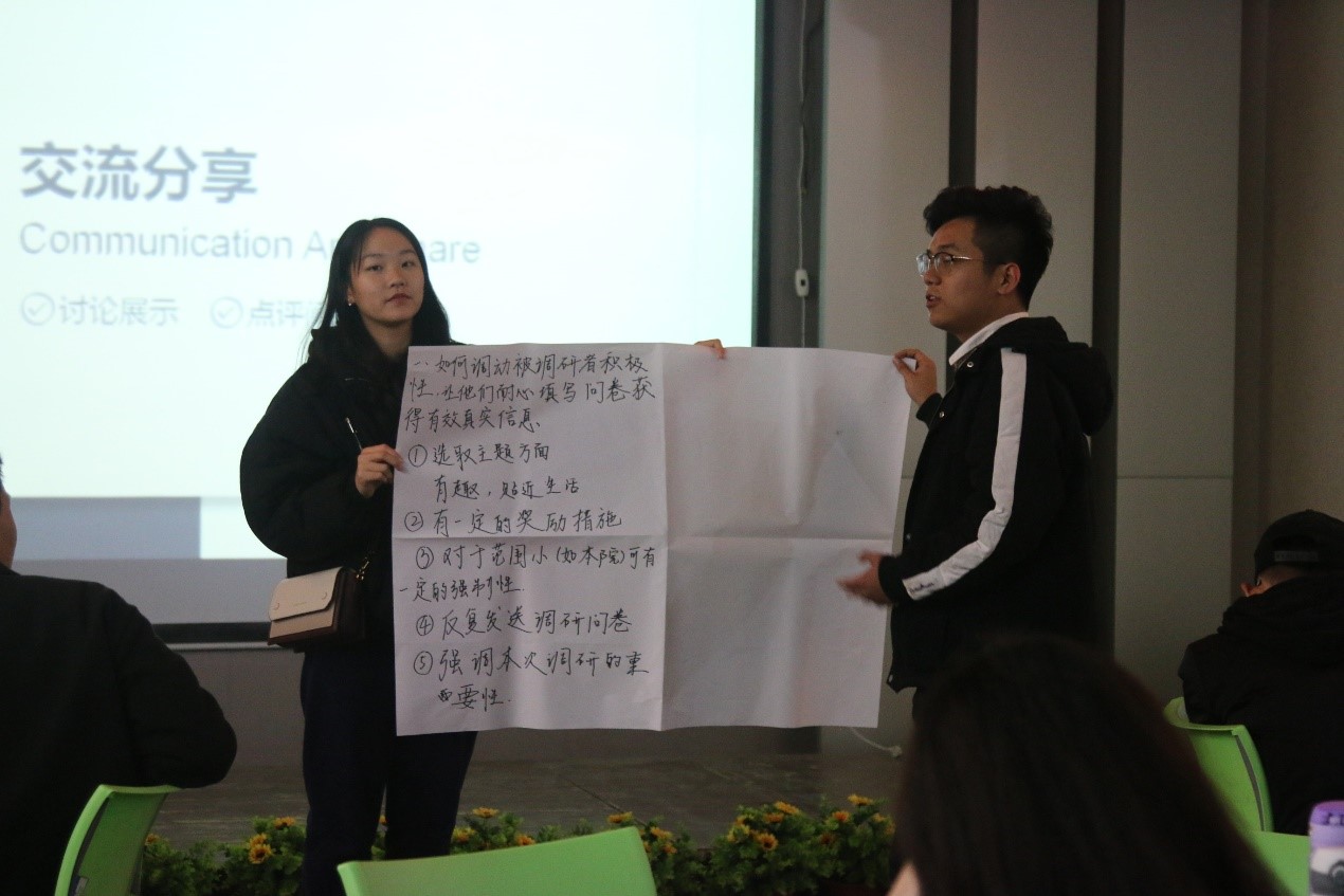 活动伊始,暖场小游戏“好汉请抱拳”起到了破冰作用,调研沙龙在欢声笑语中拉开序幕。在场同学被分为八个小组,各小组进行关于调研问题及解决方法的讨论。二十分钟后,八个小组依次上台进行讨论成果展示。不同的思想在讨论中碰撞出火花。在判断问卷真实性问题上,有小组提出可采用对答卷者进行人脸识别或在问卷中穿插矛盾性问题等方法。在调动他人填写问卷积极性上,有同学表示设置新颖醒目的题目、发红包、告知受访者信息安全等不失为可行之道。