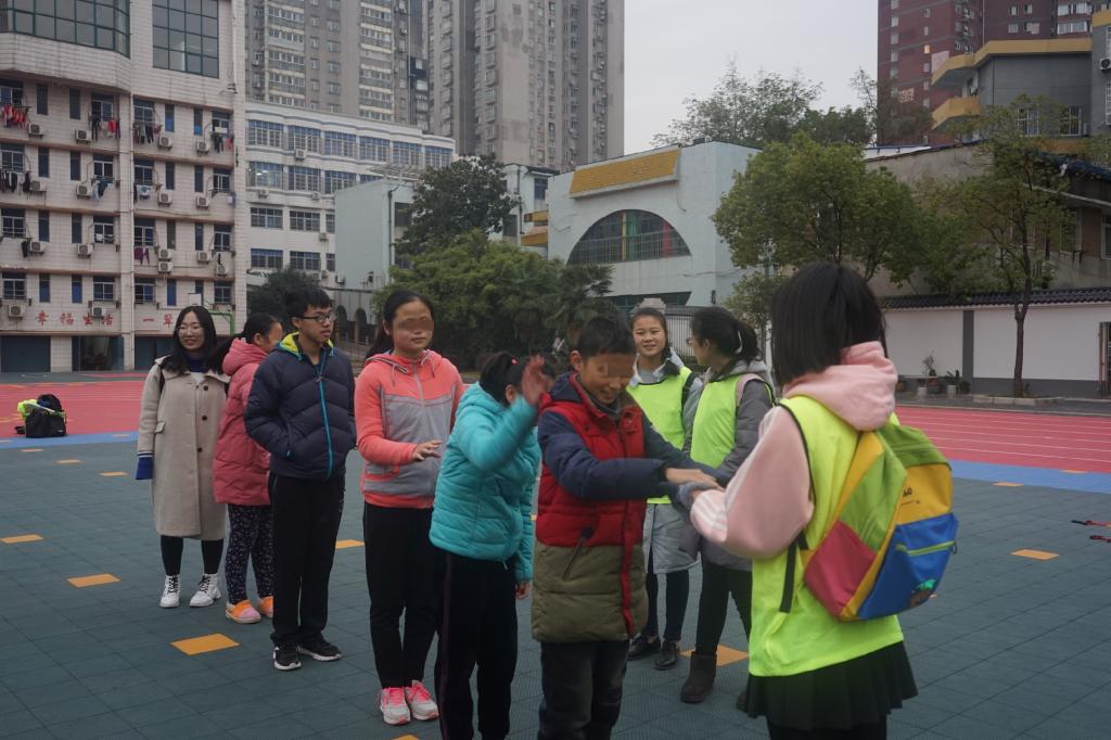 虽然活动开始之前下了雨,但孩子们和志愿者的热情丝毫不减。志愿者和孩子们被分为四组开展各项运动项目。所有参与者首先一起进行了摩斯密码游戏,孩子们排成四列,两个志愿者一前一后参与其中。站在最后的志愿者拿到摩斯密码任务卡之后,需要用肢体语言将其表述出来,再进行接力。整个游戏环节中,孩子们的脸上都露出了灿烂的笑容。