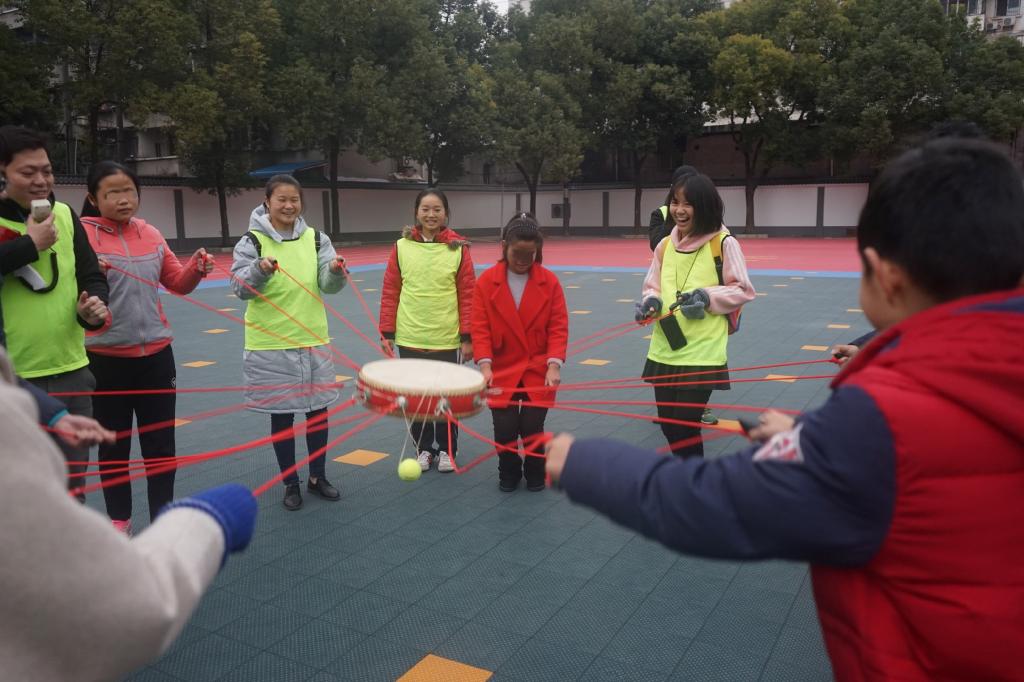 接着指导老师让四个组每位同学和志愿者手牵手围成一个圈,进行军运加油鼓游戏。在此游戏环节中,所有参与者围成一个大圈,每人手持两根连接着手鼓的红绳,当大家一起喊“一”时半蹲,一起喊“二”时站起。通过不断重复该动作,鼓上的球与鼓碰撞发出响声。在该环节中,志愿者与孩子们需要保持协调一致的动作,而盲校孩子们因为视力上存在障碍,因而这对他们来说具有一定的挑战性。但大家尽情玩味其中,热情高涨。