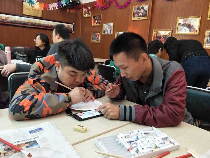 在志愿者进行自我介绍并与服务对象有了初步的了解后,各小组便领取了颜料、画笔等材料,志愿者帮助服务对象就作画内容进行构思。在这个过程中志愿者与服务对象互相沟通、增进了解。绘画过程中,组员们精心刻画每一个细节,认真学习他人如何绘画,并尝试在圆盘上进行自主创新。志愿者们与服务对象在作画过程中互相协作,发现每位服务对象潜在的需求并主动帮助。期间,服务对象还会向志愿者们主动分享自己的喜好,整个环节气氛十分融洽。