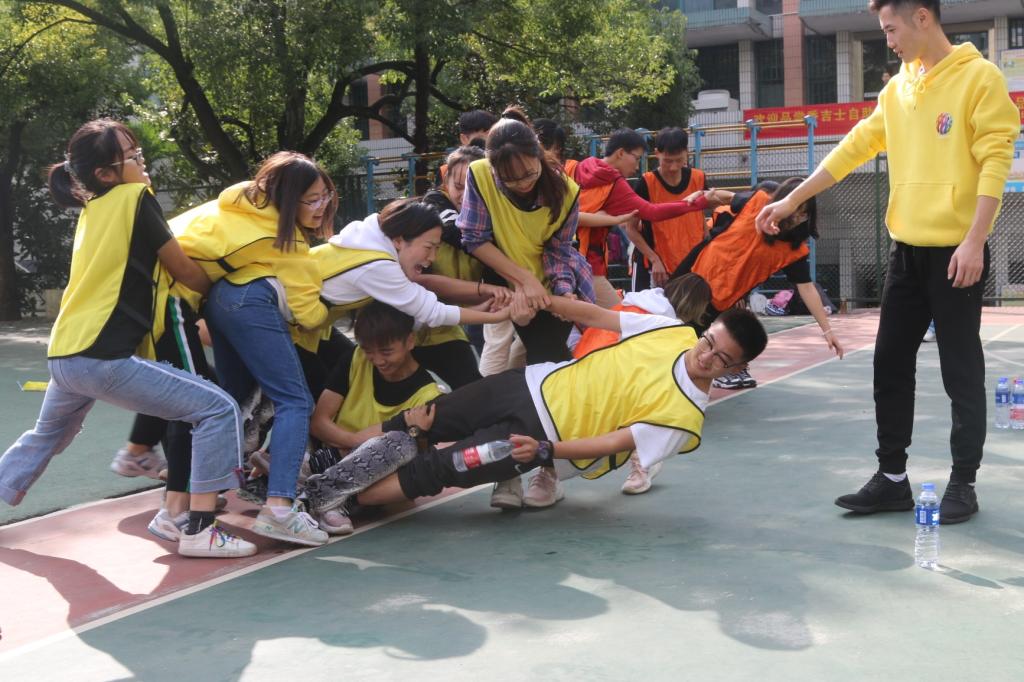 破冰活动“松鼠与大树”打破了同学们之间的隔阂,同时也活跃了现场的气氛。随后,在高级拓展训练师杨杰的带领下,我院团学成员与来自武汉其他大学的志愿者被分为六个小分队,队名分别取为“沙雕队”、“社会队”、“不佛系队”、“火箭队”、“猎鹰队”与“奇迹队”。在各队队长的带领下,每个小分队在大家面前喊出响亮的口号,摆出整齐的队形,展现本队独特的魅力。