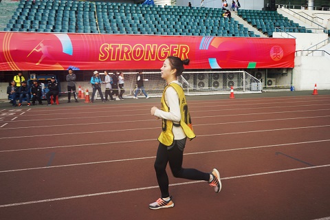 由于比赛在上午8点进行,四名运动员早早来到田径场进行热身,穿着长跑专用服的她们在阳光下显得特别精神。四名运动员被分成了三组参加比赛。当齐凤英站在跑道上等待起跑命令时,她目光汇聚在离她不远处的裁判处,只待一声枪响,与其他人一争先后。开跑后,四名运动员没有选择冲在最前面,而是保持在中间的位置,以保存体力进行最后冲刺。里程过半,不少运动员已然力不从心,在一旁陪跑的同学一直大喊“坚持住!加油!”。留守大本营的同学也站起来为她们打气。在最后冲刺的时候,女生们都使出了吃奶的力气往前冲。虽然没有取得较好的成绩,但四位运动员已发挥出了自己的最佳水平,她们表示没有任何遗憾,也非常感谢陪跑的同学一直陪在身边直到比赛结束。