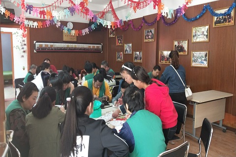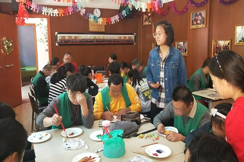 本次活动的志愿者先给自己起了便于服务对象记住的小名,并亲切地向大家做了自我介绍。相互了解后,志愿者们与服务对象间的关系亲近了许多,活动氛围轻松融洽。随后志愿者们引导服务对象诉说自己的理想,让服务对象根据自身的想象力和个性特点,在纸盘上独立完成绘画。志愿者们则静静地在旁边观察,在必要的时候给予帮助,协助他们完成创作。