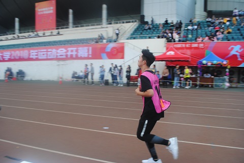 田奕龙一直保持匀速前进,遗憾的是并没有进入小组前八。而赵子涵由先前的稍稍落后到逐渐反超,最终夺得小组赛的第四名。赛后,他表示,1500米不长不短,既不能像百米冲刺那样全程保持较高的速度,也不像跑马拉松一样可以中途停下来稍作休息,所以正确的策略很重要。与其他学院一样,我院也举起大旗由几名同学接力陪跑,这期间,他们不仅要跟着运动员的步伐,还要注意闪避足球场内的摆设与拍照的同学。陪跑员之一的李宁说:“在陪跑过程中,陪跑的同学能共商共建共享,齐意齐心齐力,团结协作,相互扶持,给场上的运动员以莫大的支持,但与此同时,陪跑已然非常辛苦,在场上的运动员更是勇气可嘉。”