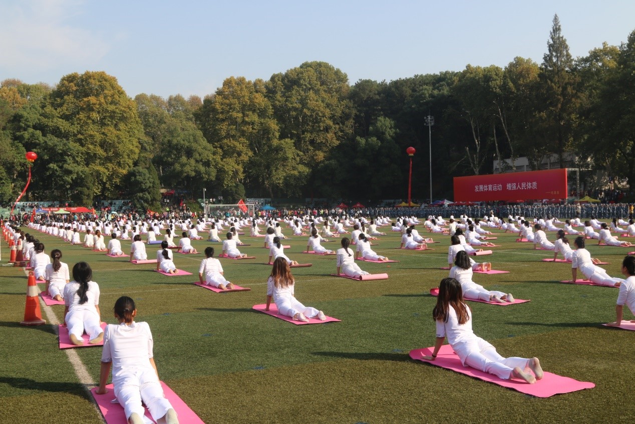 由我校200余名教职员工组成的瑜伽方阵率先带来了精彩的表演。她们身着白衣,手拿方垫,迈着整齐的步伐进入观众的视野,优美的动作表现出“刚与柔”的较量。随后,伴着激情澎湃的音乐,2000余名来自各个学院的女生向主席台走来。历经一个多月的训练、排练,广播操表演即将盛大开演。她们身穿迷彩,佩戴白手套随着口令做出一致的动作,充分展现出我校学生蓬勃向上的精气神。轻盈灵动的体操表演让观众赞不绝口,惟妙惟肖的八龙戏珠博得观众的阵阵掌声。