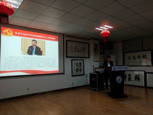 大会第五项,学习习总书记在全国教育大会上的讲话。就业处支部组织委员洪满春老师带领在场党员学习了习总书记在全国教育大会上的重要讲话精神,并回顾了习总书记讲话的10句金句,诸如“让广大教师享有应有的社会声望”等,让在场党员们深受鼓舞。