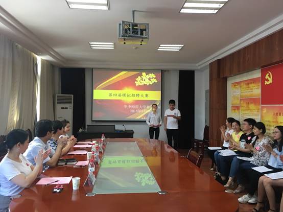2018年5月29日下午3:00,由我院研究生会综合服务部主办的第四届校园模拟招聘大赛在3号楼社会学院会议室如期举行。本次活动旨在增强我院研究生的心理素质和应聘技能,为同学们提供一个展示自我的舞台。担任此次模拟招聘大赛的评委有华中师范大学社会学院党委书记汪继平、就业处副处长李方红、博雅社工机构王玲老师、社会学院研究生辅导员翟娟老师,我院17级部分在校研究生出席了本次活动。