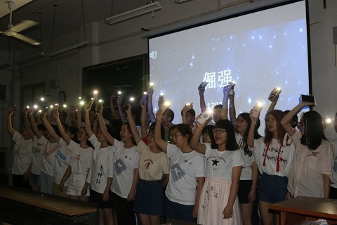 如果说一曲红歌抒发了同学们的爱国热情,班歌部分就展现了社院学子的青春风采。一至四班带来的班歌分别为《粉红色的回忆》、《倔强》、《明天你好》、《和你一样》。各班在表演过程中可谓亮点多多。其中,一班同学根据歌词内容和旋律进行花式比心、集体摇摆等,引发全场叫好。而二班从一开始跟着节奏打响指,到中间变换队形,再到最后于黑暗中集体挥舞手机闪光灯,更是赢得全场雷鸣般的掌声和欢呼。三班全体则充分阐述了“温柔且坚强”的内涵,柔和的歌声里传达出对明天的美好期许。四班别出心裁,由班长刘宇骁弹奏吉他作为伴奏,吉他声与歌声相伴,谱写青春最美的篇章。