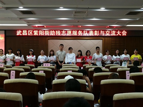 在两位领导发表完致辞后,紫阳街公共服务办公室副主任麦尔巴哈·乌拉木宣读了紫阳街优秀助残志愿者表彰文件,麻旎和张宗刚给华师社院青协、华师信管青协以及武大资环青协等七个志服团队颁发“最佳助残志愿服务团队”证书。随后,李金督给武汉理工大学亢茜志愿服务队、华中农业大学红杜鹃爱心社等八个志服团队颁发“先进助残志愿服务团队”证书。
