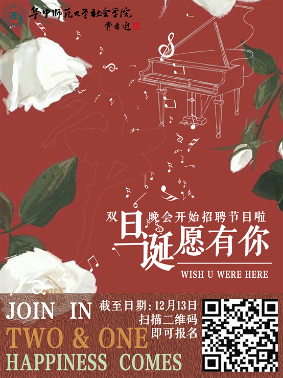 为进一步加强学院各年级之间的文化交流,培养学院良好文艺氛围,使同学们以饱满热情的心态迎接期末考试,促进本院学子学习和生活的同步发展,社会学院团委学生会拟定于2019年12月27日举办社会学院2019年“Two & One”双旦晚会。