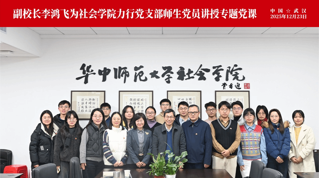 12月23日下午,副校长李鸿飞为我院师生党员讲授专题党课并开展工作座谈会,活动在文科科研楼北楼715举行。社会学院党委书记曾艳梅、全体专职辅导员、全体学生党支部书记、力行党支部师生党员代表参与本次活动。 会上,力行党支部书记吕方老师系统介绍了支部的基本情况、过去一年在组织建设、理论学习、实践育人等方面取得的成效,并就下一阶段深化党建与专业融合、强化青年使命担当等工作作了展望。李鸿飞副校长以《做教育强国建设的奋斗者:...