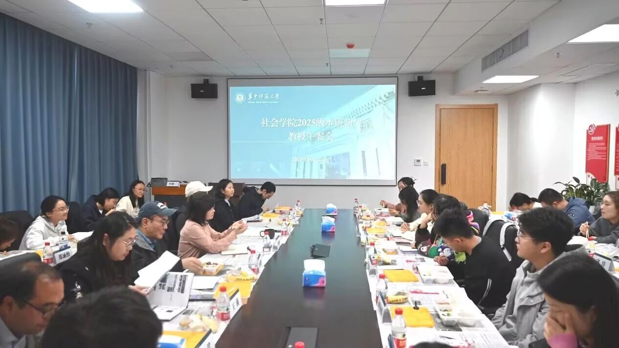 2025年10月27日中午,社会学院2025级本研新生午餐会在文科科研楼北楼715会议室顺利举行。学院党委书记曾艳梅、院长符平、副院长李钧鹏、副院长顾永红、党委副书记王莉,以及研究生导师代表王欧、本科生班主任代表黄君、研究生辅导员翟娟、本科新生辅导员熊一虎与本研新生代表共聚一堂,围绕入学适应、学业困惑与生涯发展进行了深入而热烈的交流。熊一虎主持活动。