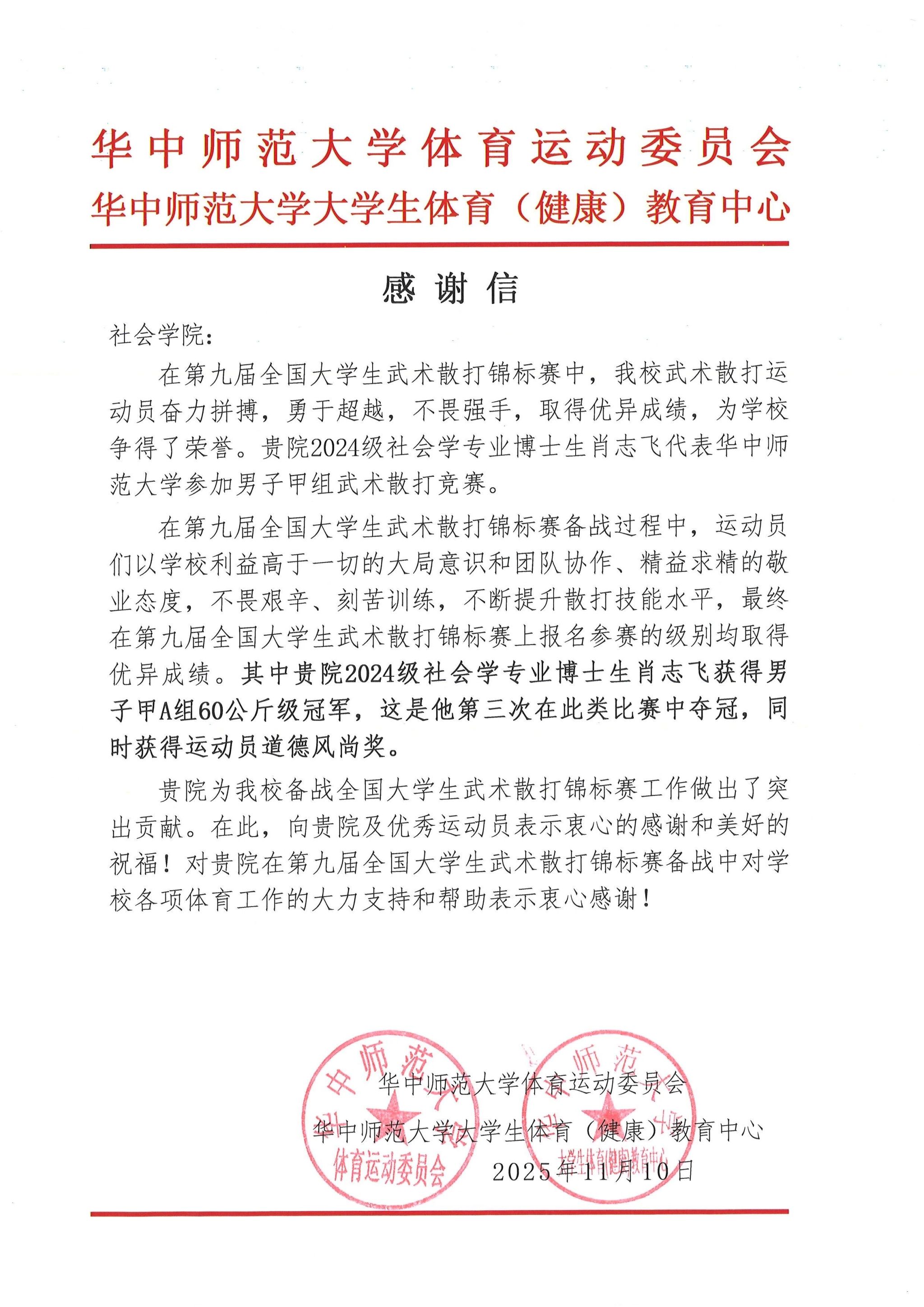 在第九届全国大学生武术散打锦标赛中,社会学院2024 级社会学专业博士生肖志飞同学脱颖而出,勇夺男子甲 A 组 60公斤级冠军,并获评 “运动员道德风尚奖”。这是他第三次在该赛事中夺冠,延续了在该项目上的优异表现。