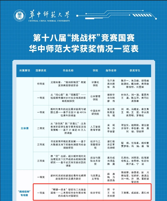 据悉,“挑战杯”竞赛是由共青团中央、中国科协、教育部、中国社会科学院、全国学联和承办地省级人民政府共同主办的一项具有导向性、示范性和群众性的竞赛活动。该赛事1989年开始举办,已发展成为每届吸引200多万名大学生参与的“大舞台”,被誉为当代大学生科技创新的“奥林匹克”盛会。近年来,社会学院一直在学习贯彻习近平新时代中国特色社会主义思想走深走实上下功夫,依托学科特色与专业优势,以理论为支撑拓宽研究思路,扎根于田野获取经验事实,积极服务国家战略,扎根中国大地开展科学研究。今后,学院将紧紧围绕立德树人根本任务,创新“三全育人”工作思路,继续培育以党建引领、竞赛引航,教师、学生多方参与的育人品牌,以赛促教,以赛促学,以赛促创,为培养专业型、创新型、实用型人才持续赋能。