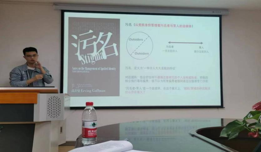 最后刘应响同学综合相关的社会学著作,从时间纵向的角度展开对越轨者的研究成果分享。他指出,在《规训与惩罚》中,全景敞式主义通过“权力-知识”结合对小到个人身体、大到国家社会进行一种监控和规训。无论是罪犯、疯子、性反常等越轨者,还是普通人,都处于环形监狱、疯人院、课室、大街小巷等无处不在的监控中。《精神病院》一书把精神病院视为全控机构,从社会建构论范式解释精神疾病,认为全控机构把大批有相似境遇的人集中在一起,使他们在相当一段时期内断绝与社会的联系,在封闭式正式管理中起居生活,这被剥离的不仅是其原来担负的社会角色,还彻底地被剥夺其私人物品。《局外人:越轨的社会学研究》书中阐释越轨并不是指个人行动的性质,而应归结为他人执行规范和判断的结果。《在逃:一个美国城市中的逃亡生活》提出大众收监概念,即入狱的水平明显地高于历史上的和可比较的尺度,并且集中在人口的特定群体之上,大众收监对越轨群体进行控制,并形成一个常态的在逃社区。