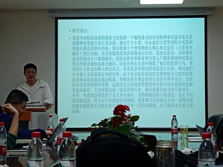 接着由王东猛同学进行分享,他讲述了两种解释越轨行为的模型:即时模型(共时性分析,所有导致现象产生的变量因素同时产生作用,越轨行为的形成过程成为一个黑箱)与连续性模型(历时性分析,阶梯式解释环节,行为模式的形成过程分析是一个具有先后次序的解释模型)。并且进一步分享运用连续性模型开展的一个经验研究和自己一个未完成的研究。1.大麻吸食是由于好奇驱使,然后学习吸食技能,感受药效并享受,最后与社会控制斗争的连续过程。这是一个阶梯式的发展过程。2.运用越轨社会学视角分析盗窃行为的机制,王东猛采用半结构式访谈法,按照一个粗线条式的访谈提纲对盗窃者及其亲属和友邻进行非正式访谈,运用连续性模型分析行动者是如何接触并走向偷窃,又为何退出这一违法获利行业,最后选择其他合法行业谋生。