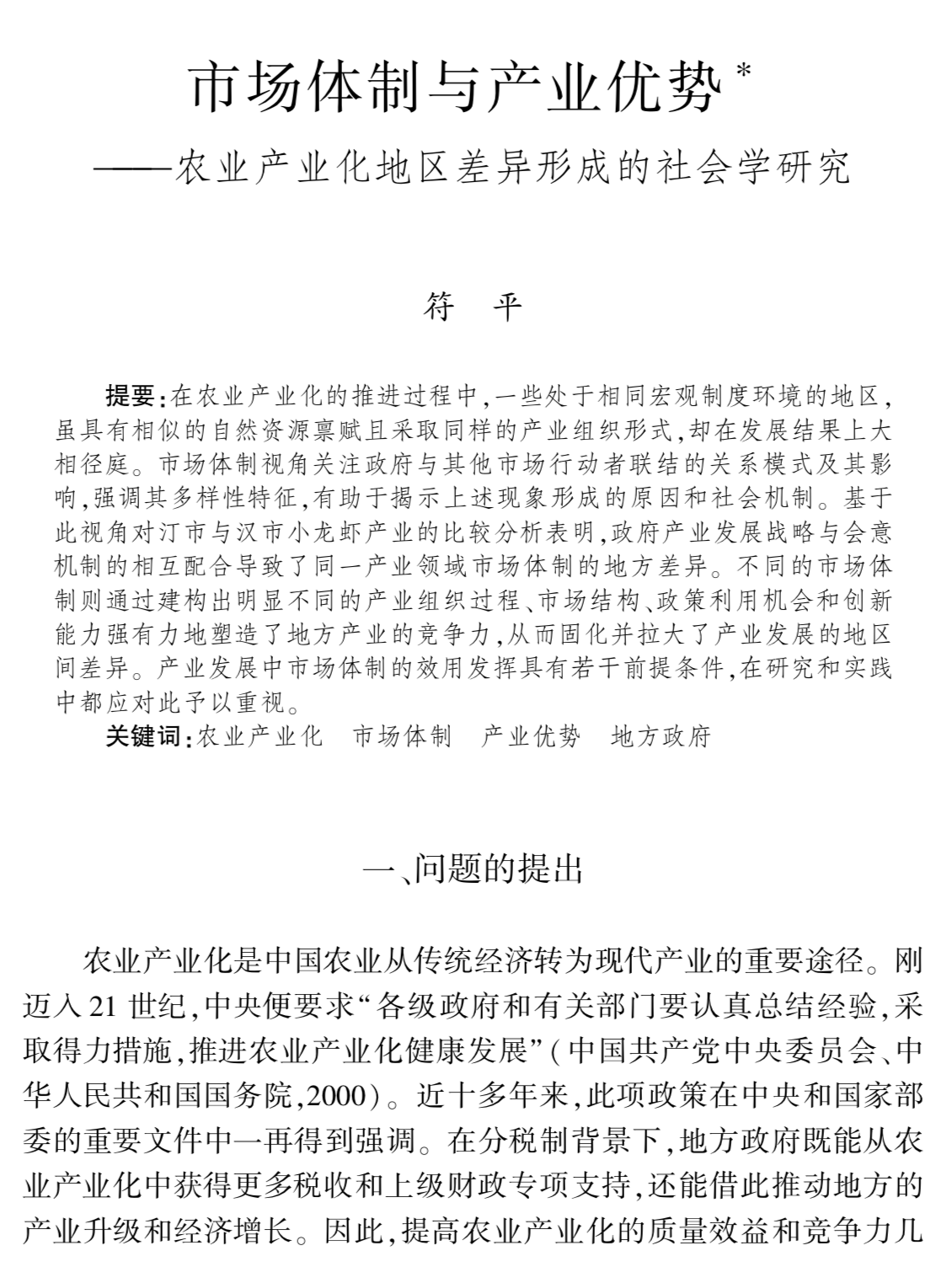 符平教授的获奖成果旨在解释农业产业化发展过程中的一个重要现象:一些地区虽然处于相同的宏观制度环境,采取同样的产业组织形式且具有相似的资源禀赋,却在发展水平和结果上大相径庭。有的地区表现平平,而有的地区拥有独特优势、产业不断升级提档,甚至占据行业鳌头地位。符平教授的论文探讨了这种地区间发展差异尤其是特定地方的产业优势何以形成的问题。通过提出并区分“引领型市场体制”与“自发型市场体制”这对理论概念,该篇论文通过市场体制的多样性视角分析了不同的市场体制如何作用于地方的产业发展,从理论和经验层面解释了在同样的外部环境和相同的产业结构的背景下,何以产生了地区间的产业发展差异问题。论文指出,市场体制塑造了农业产业化过程中市场主体与非市场主体的关联形式、政府资源的流向以及非市场治理机制的作用空间,通过建构出明显不同的产业组织过程、市场结构、政策利用机会和创新能力而强有力地塑造了地方产业的竞争力,从而固化并拉大了农业产业化发展的地区间差异。该文也从理论上检讨了市场体制作用于产业优势的前提条件。