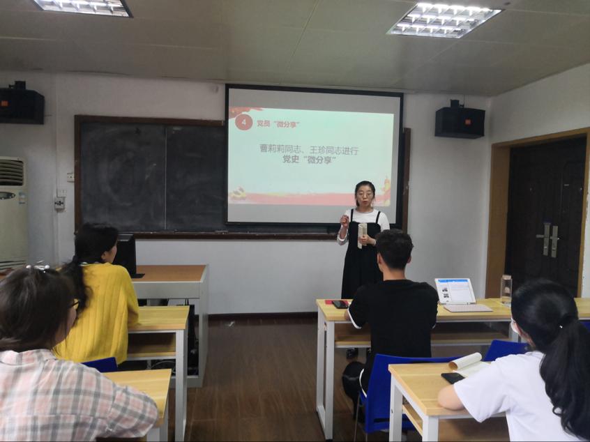 紧接着是支部特色党史学习活动:党史“微分享”。王珍同志通过PPT演示的方式分享了周恩来总理的人生轶事,生动形象地展现了周总理廉洁奉公、严于律己的可贵品质。曹莉莉同志则用主题演讲的方式分享了中共二大的光辉历程,她重点分享了中共二大的多个“开创性第一”,如第一次明确提出反帝反封建的民主革命纲领、制定第一部正式党章、第一次明确阐述党的民主集中制原则等等。
