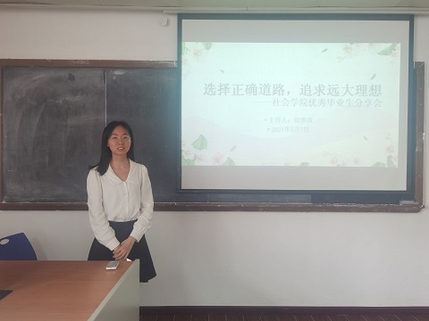 (通讯员 文紫仪)5月7日下午2:00,社会学院毕业生分享会在院楼319教室顺利举行。本次分享会由社会学院学创部承办,学创部部委徐雅琪主持。会议邀请了2017级的阮晓庄和杨可欣两位同学作为嘉宾,为社会学院各年级学生分享学习经验。