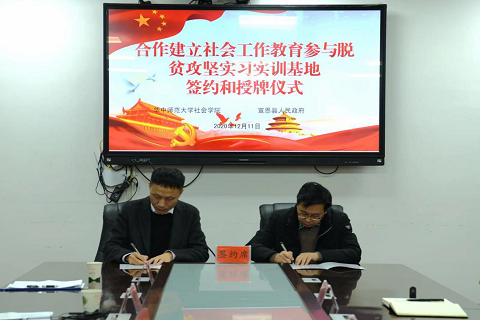 接着,社会学院副院长郑广怀教授与宣恩县人民政府副县长胡晓洪同志签署合作共建协议;社会学院院党委书记卢治平同志为宣恩县授牌,宣恩县人民政府扶贫开发办公室主任李新同志接受实习实训基地牌匾。签约授牌意味着我院与宣恩县正式建立合作关系,是宣恩县巩固提升脱贫攻坚质量的重要环节,同时也是华中师范大学社会学院贯彻落实中国社会工作教育协会关于社会工作教育对口扶贫工作的重要实践,这对于宣恩县和华中师范大学来讲,都有着重要的实际意义和历史意义。