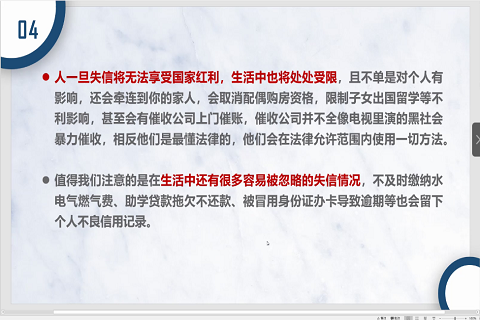 在个人信用报告的介绍中,岑茂祺首先向同学们解释了什么是信用报告和个人征信系统,他着重提到了其中显示的查询记录,并提醒同学们不要进行频繁地信用报告查询,以免被银行系统认为有不轨意图。之后,他说明信用记录在个人信息、个人贷款利率和贷款额度等方面体现的重要性。与此同时,岑茂祺也告诉大家失信行为将会带来的不良影响,并强调:“金钱不能抹掉个人的不良信用记录,大家千万不要忽略日常生活中可能的失信情况,以免带来不必要的麻烦。”当邓雪问到还“花呗”是否包含在信用还款记录之内,岑茂祺为此做出解释,“花呗”并没有接入我国银行的系统中,所以只是一个普通的还款过程。