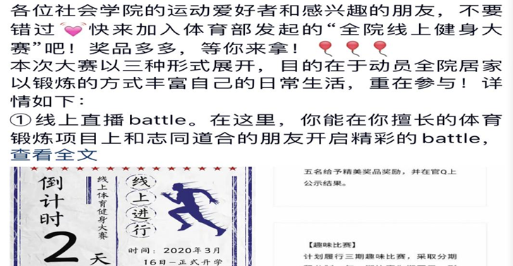 与此同时,体育部还设置了锻炼分享环节,面向所有社院师生,呼吁广大学子疫情期间停课不停练,健身不偃息。同学们积极参与,纷纷晒出居家期间与家人们共同锻炼的视频照片,分享在家中的健身情况。