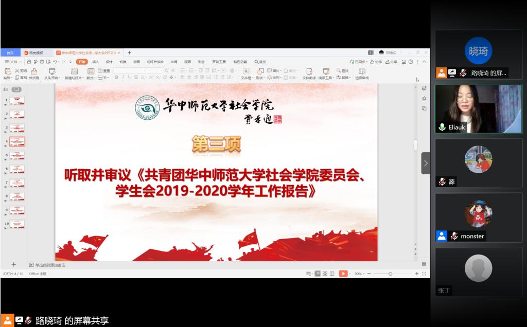 5月22日晚上6点,华中师范大学社会学院团委学生会换届选大会在腾讯会议举行,为听取第二十五届团委学生会工作报告以及选举产生第二十六届主席团成员。社会学院党委副书记寇娜,团委书记甄诚,2017、2019级辅导员郭京骁、2018级辅导员刘子玄出席本次会议,共有114名学生代表参会,会议由学生会副主席路晓琦主持。