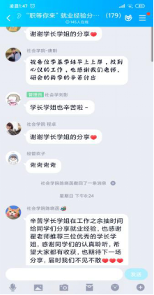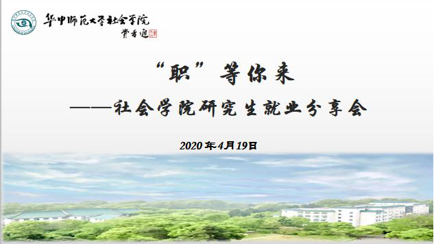 2020年4月19日18:30,社会学院顺利开展了第一期“职等你来”线上就业经验分享会。社会学院研究生辅导员翟娟、社会学院以及来自经管学院、公管学院的近百余名研究生一同加入了线上分享会,会议由社会学院研究生会文艺部干事李梦蝶主持进行。