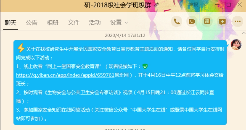 为了引导学生将总体国家安全观贯穿抗疫全过程,履行应对突发公共事件的职责义务,提升维护国家安全的自觉性和主动性,社会学院研究生积极响应学校《关于在我校研究生中开展全民国家安全教育日宣传教育主题活动的通知》的工作要求,在各班群积极宣传且组织同学观看“同上一堂国家安全教育课”,并于2020年4月15日以2018、2019社会学两个党支部为单位分别开展了党员线上讨论。