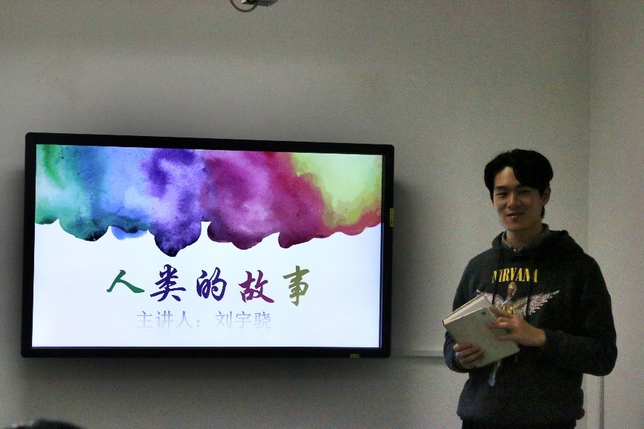 读书会于下午两点正式开始。刘宇骁首先上台,向大家介绍了美国作家旁龙的《人类的故事》,并分享了自己的阅读体验。他按照此书脉络,将讲解分为前言、人类的过去、古希腊文明、罗马帝国文明、文艺复兴、结尾六个部分,讲述了地域对文化的改造作用,古希腊与古罗马文明的兴衰以及文艺复兴的历史,启发同学们从不同角度观察历史。