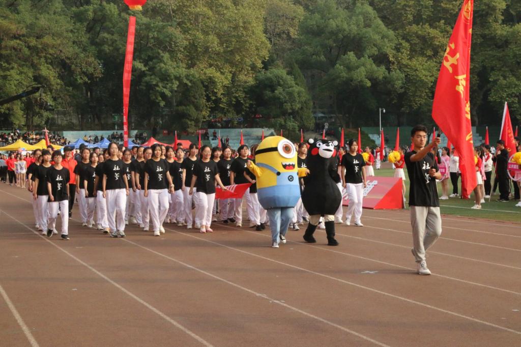 十一月的上午,彩旗招展,标语飞扬。首先向主席台走来的是国旗护卫队。他们伴随着庄严的进行曲,步伐稳健而坚定,精神饱满,气势昂扬。各学院方阵紧随其后,啦啦操、舞龙舞狮、音乐演奏、无人机横幅等表演均向全校师生展现了学院特色。其中,社会学院的学生们衣着黑色的院服,面带笑容,昂首阔步。他们喊着“风吹日晒,社院最帅”的口号,用方阵队形摆出“中国”两个字,表达着他们对祖国母亲的祝福。独具特色的“小黄人”、“熊本熊”人偶也在方阵精彩亮相,让人过目难忘。全场掌声雷动,久久不绝。