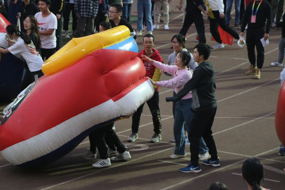 作为校运动会第一天最后一个项目——学生混合组和“鞋”共进因与男子组1500米场地冲突,故延期半小时后在田径场的百米跑道上正式开赛。和“鞋”奋进,鞋与谐相谐音,需两位同学抬着一只大型“鞋子”向前跑去,并与终点同学交换,完成接力,时间最短的队伍获胜。比赛开始之前,我院队员们认真讨论,商量上场顺序。伴随裁判一声哨响,我院选手们配合默契,带着巨型“鞋子”奋力向前冲刺。在比赛结束后的采访中,我院选手均表示“友谊第一,比赛第二,在比赛过程中,不但增进了队友间的感情,也认识了很多外院的同学。”