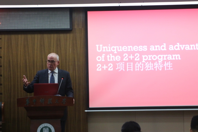 为了让新生及家长们更好地了解我院专业社会工作的澳大利亚合作方,典礼特别邀请了格里菲斯大学社会工作与人 类服务学院的Patrick O’Leary教授,为大家介绍格里菲斯大学的社会工作专业以及“2+2”合作项目。Patrick 教授从华师学生在格里菲斯大学的发展状况、社会工作专业的深刻内涵、就业前景、就业方向等方面做了详细介绍。教授讲到,格里菲斯大学社会工作的办学能力每年都在不断地提高,目前在全澳州排名第二,很多华师的学生通过“2+2”项目在格里菲斯大学获得了更丰富的学习经历并取得了卓越的成绩,格里菲斯大学承诺,会对每一个到来的华师学生负责。