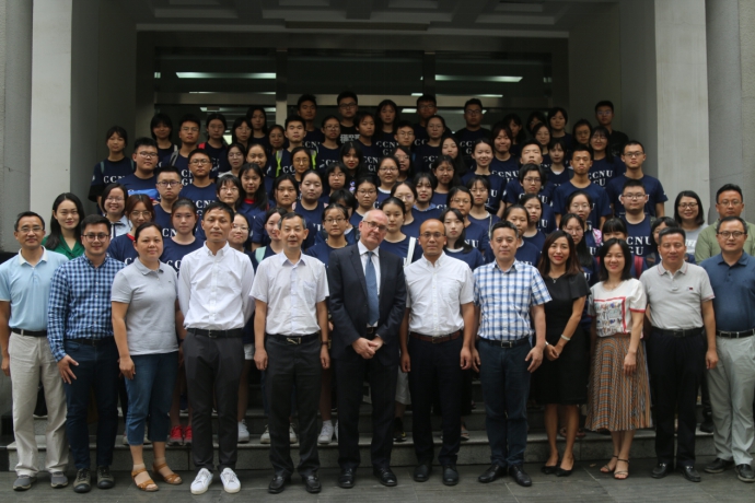(通讯员刘星雨 李伟源)8月31日下午4时,社会学院2019年中澳合作办学新生开学典礼暨新生见面会在逸夫会议中心报告厅举办,格里菲斯大学社会工作与人类服务学院Patrick O’Leary教授、中澳社会工作合作办学项目澳方协调人梁健强博士、国际工作部Sherman Xia先生、国际工作部Jennifer Zhang女士,澳大利亚教育管理集团学术部部长陈距、武汉区高级主任黄璟、华师项目英语课组组长魏雪,华中师范大学国际处副处长洪峰、国际合作与交流处项目专员刘方、教务处中外合作办学项目主管刘红,社会学院党委书记卢治平、院长符平、党委副书记寇娜、副院长郑广怀、副院长徐晓军、社会工作系教授杨生勇、社会工作系副主任高玉琪、社会工作系副主任吕方、社会工作系副教授刘杰、程玲、顾永红、社会工作系讲师李雪燕、洪佩、教务管理员朱红、国际化秘书郭之天、中澳合作办学项目协调人黄君博士、2019级辅导员郭京骁、社会实验工作教师徐燕,社会工作(中澳班)全体新生及部分学生家长出席了本次典礼。典礼由徐晓军主持。