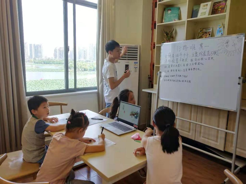 队员们准备充分,课程量体裁衣,内容丰富完善,针对湖畔学堂年龄相对较大的小朋友,队员们开展了古诗、人物卡通画、趣味体育等课程,以便让小朋友们带着兴趣去探索知识,在快乐中掌握知识。作为小朋友们的老师,队员谭鸿伟精心准备了古诗词《行路难》的课程,他深入浅出而又诙谐幽默的讲解,带着孩子们在中华传统文化的魅力中漫步。针对低龄儿童,队员们则降低课程难度,设置了英语单词拼写课、《三字经》的诵读与《弟子规》的讲解课程等。