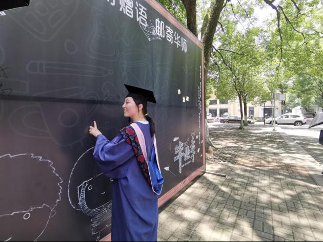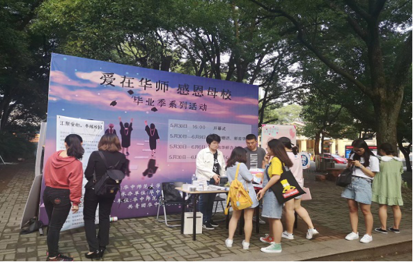 5月30日-6月9日“情诗赠语,邮寄华师”、“我与华师合个影”和“汇聚爱心,奉献母校”活动在东区小树林开展。缱绻情丝,道不尽心中的无限眷恋。即将离开华师的毕业生们,或许会有想说却还没来得及说的话,想感谢却还没有感谢的人。“情诗赠语,邮寄华师”活动就给毕业生们提供了这样一个机会,学子们在东区小树林的留言板上留言,写下对母校的祝福和对自己的期许。毕业生们在东区小树林与巨型毕业证合影,或是领取创意合影板在校园各处合影留念,留下美好瞬间。我院2018级本科生高俊德表示,“记忆或许会模糊,但相片不会,希望学长学姐们可以用相机将美好定格。”