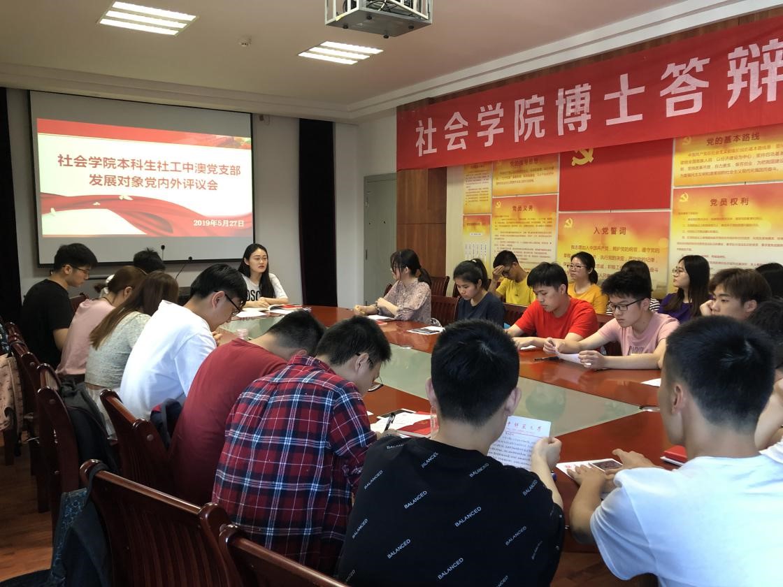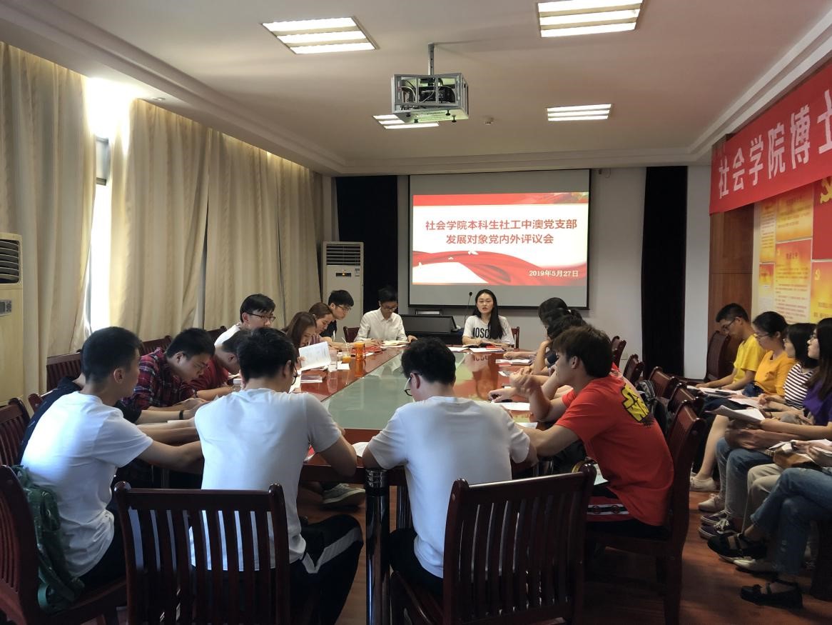 2019年5月27日中午,社会学院本科生社工中澳党支部于院会议室召开了拟发展对象的党内外评议会。本次会议由党支部书记郭京骁主持,参与会议的主要人员有支部全体党员、预备党员与群众评议代表。