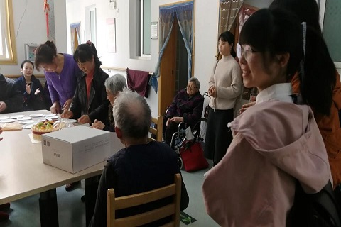 当日还正值几位老人的大寿,趁着阿姨们给老人切蛋糕的空隙,志愿者们自发地给老人唱起了生日快乐歌,并在歌曲唱完之后给老人送上最诚挚的祝福。