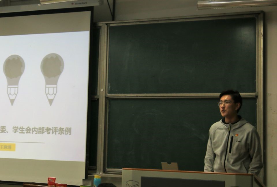 随后,维权与测评部部长王意博宣读华中师范大学第二十四届社会学院团委、学生会内部考评条例。该条例由总则、考评内容、考评细则三个部分组成。他对于学生会成员的考评方法及记分要求进行详细说明,强调指出:“考评遵循客观公正原则、民主公开原则、切实可行原则。”