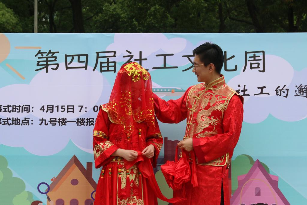 进行婚礼体验的同学中,既有甜蜜的情侣,也有感情深厚的好友搭档。进行婚礼体验的第一组是一对青年情侣,他们在工作人员的指引下完成了传统中式婚礼的礼仪流程。一位工作人员介绍到,之所以举行婚礼体验的活动,是因为家庭是人生的港湾,而婚姻是家庭的基础,希望能帮助大家提前体验这段生命历程。