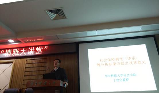 2018年04月08日19:00-21:00,由华中师范大学教务处主办,华中师范大学社会学院、湖北省社会发展与社会政策研究中心承办的第186期“博雅大讲堂”在我校逸夫国际会议中心一楼报告厅举行。华中科技大学社会学院院长、社会保障研究所所长、博士生导师丁建定教授作客本次讲堂,进行题为《社会保障制度的三个体系:一个分析框架的提出及其意义》的学术报告。华中师范大学教务处副处长曹阳、尹梦老师、社会学院符平院长、徐晓军副院长、出席本次报告会。本次报告会由徐晓军教授主持,部分本科生和研究生参加了本次报告会。