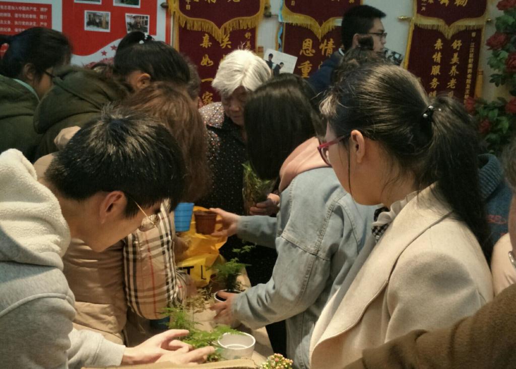 3月18日上午,2018学雷锋志愿服务月重点项目——雷锋精神进社区、进学校系列活动顺利开展。社会学院社工协会23名志愿者来到江汉区富豪社区舒美老年公寓,带来了文竹、长寿花等盆栽供老人们免费认养,并开展了“情暖夕阳,绿意人生”为主题的园艺知识学习课堂。