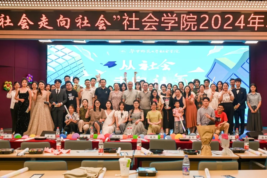 2024年6月11日晚,华中师范大学社会学院2024年“从社会走向社会”毕业晚会于文科科研楼一楼报告厅顺利举行。社会学院党委书记冯圣兵、院长符平、副院长李钧鹏、党委副书记王莉及学院部分专任教师和行政人员出席了本次活动。晚会由硕士研究生孙艺晨,本科生韩羽真、张骏、毕雨佳、王启晨主持。