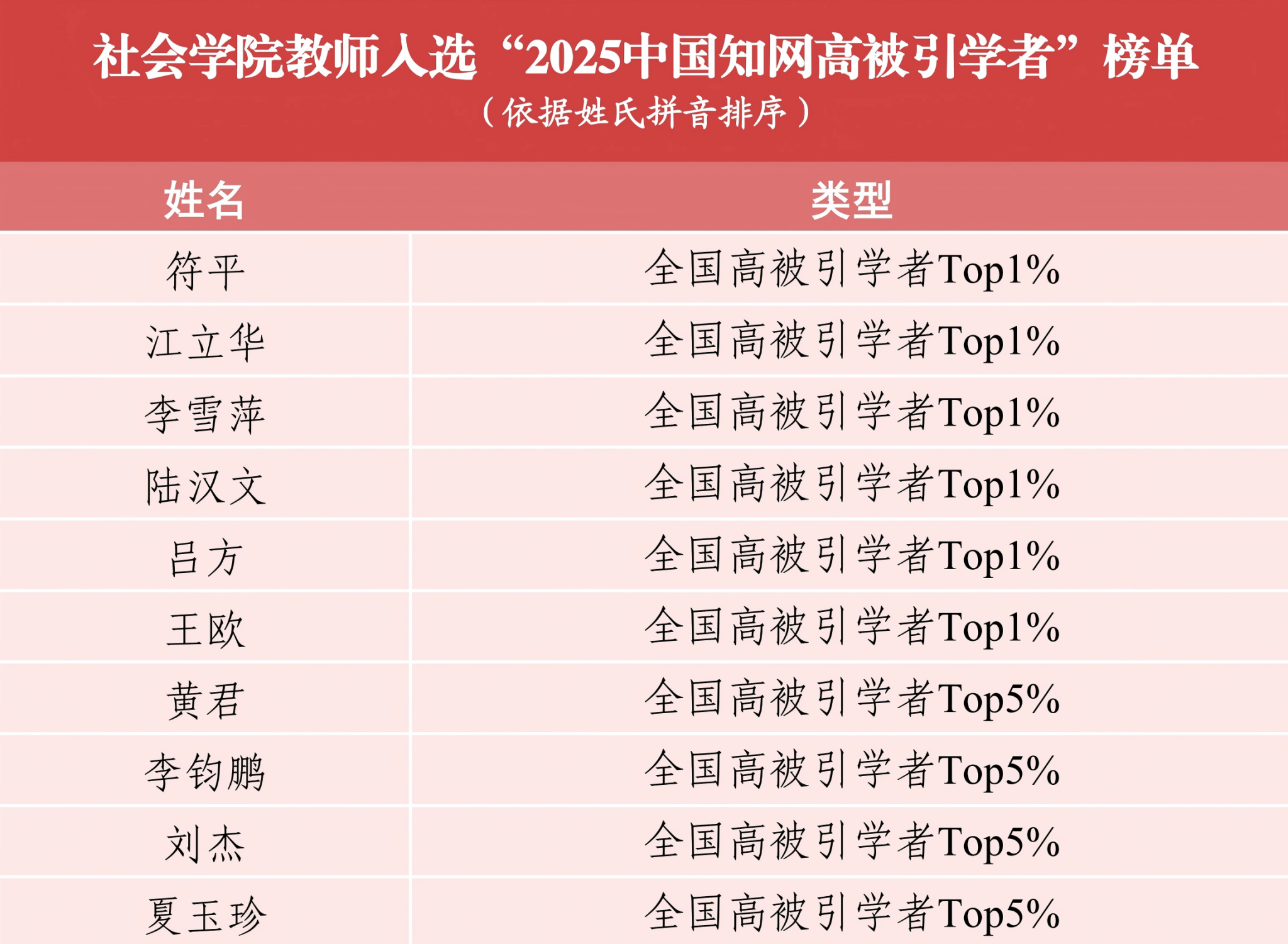 近日,中国知网中国科学文献计量评价研究中心正式发布“2025全国高被引学者”榜单。社会学院10位教师凭借在社会科学领域的扎实研究成果和广泛影响力成功入选,涵盖社会学、应用经济学、农林经济管理、政治学等多个学科。其中,6位教师入选“全国高被引Top1%”,4位教师入选“全国高被引Top5%”,充分彰显学院在人文社会科学领域的学科积淀与科研实力。