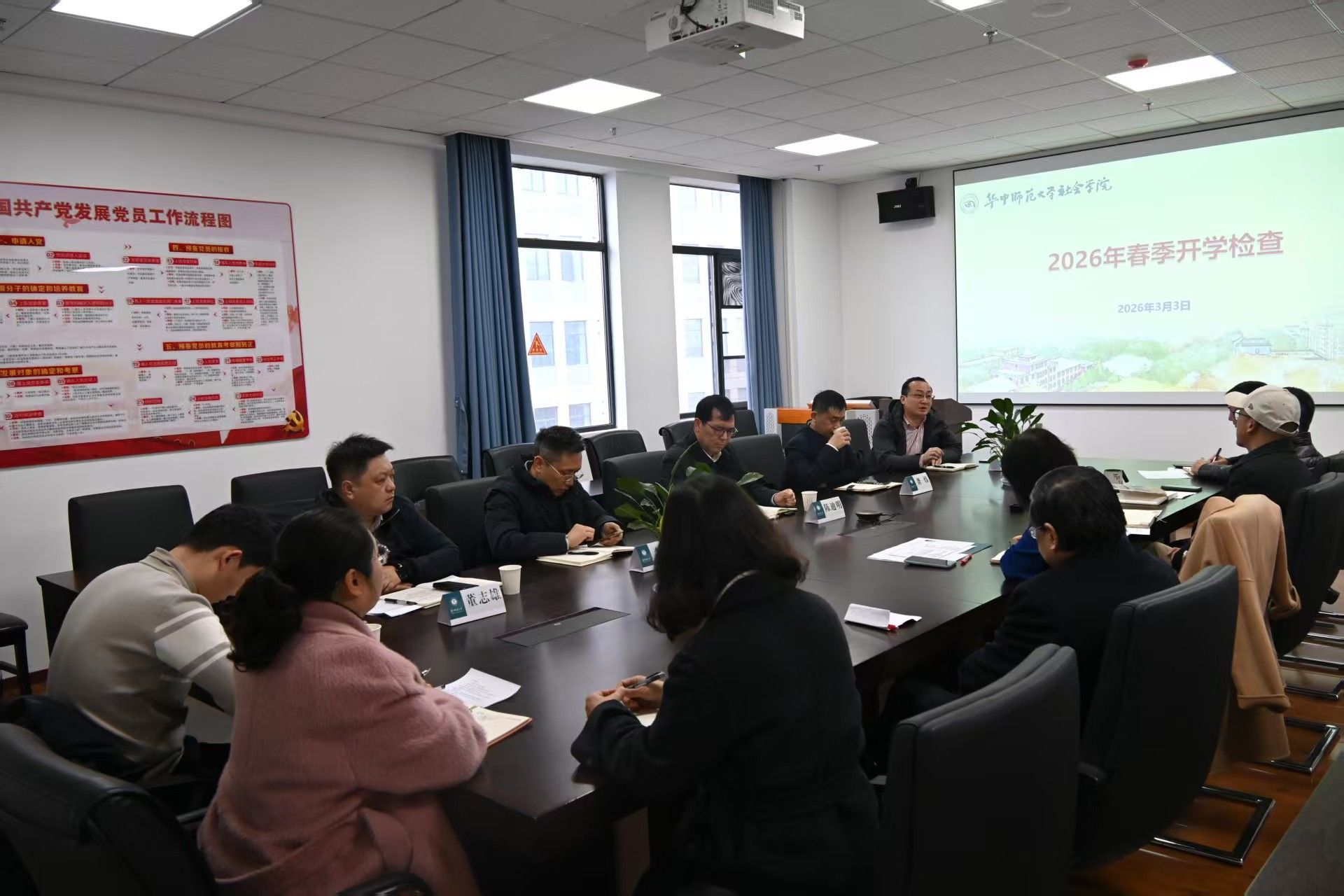 在听取汇报和交流发言后,校党委副书记陈迪明作总结讲话。他高度评价学院春季开学工作井然有序、各项事业发展态势良好。陈迪明指出,2026 年是学校发展关键之年,社会学院要深入贯彻学校务虚会精神,主动融入学校发展大局,并对下一步重点工作提出三点要求:一是坚持顶层设计,紧扣国家战略与“双一流”目标,科学编制实施“十五五”规划,引领内涵式发展;二是聚焦高质量就业,构建全员全程工作体系,实施精准帮扶,深化产教融合;三是树牢底线思维,压实意识形态工作责任,紧盯心理、消防等关键环节,筑牢校园安全稳定防线。