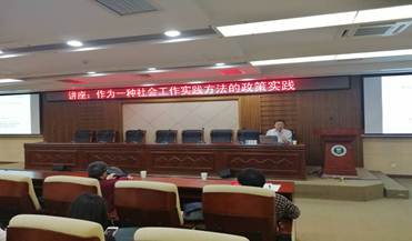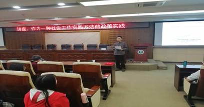 讲座伊始,郑广怀老师向大家隆重介绍了陈树强教授,并对陈教授的到来表示欢迎。随后陈树强教授开始了本次的演讲。他认为社会工作专业不论是在学术研究中还是在具体的服务实践过程中都存在对政策实践关注不足的现象,并由此提出相关问题引发同学们的思考。